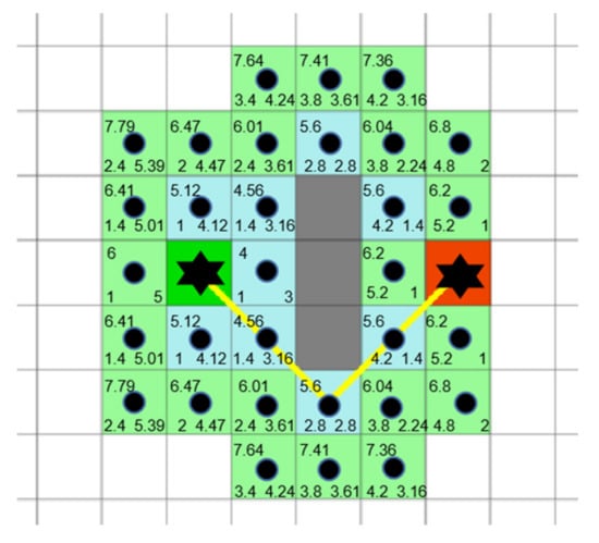 The A* algorithm path planning diagram based on the Manhattan distance is shown in Figure 2, in which the lower-left corner of each square is the true moving cost generation value g(n) from the starting node to the current node, the lower right corner represents the estimated mobile generation value h(n) from the current node to the target node, and the upper left corner represents the overall cost estimate f(n) from the starting node through the current node to the destination node. The green and red grids are the starting and target nodes, and the gray grids are the obstacles. According to the definition of OpenList and ClosedList mentioned above, and in connection with the basic principles of the A* algorithm, it can be seen that the light blue grids are the nodes recorded in ClosedList, and light green grids are the nodes recorded in OpenList but rejected for inclusion by ClosedList.