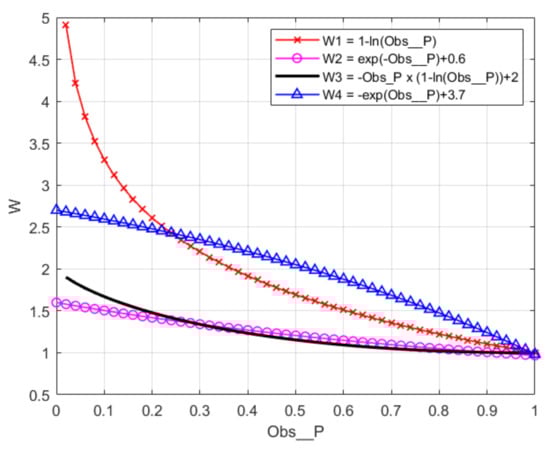 Through analysis, it can be seen that Obs_P and W should be inversely proportional to each other, and the function is designed from this aspect. Four adaptive weight functions W(Obs_P) based on Obs_P in the map scene were designed and are shown in Figure 4.