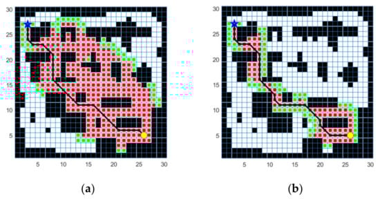 To verify the impact of the adaptive weight strategy on path planning, the traditional A* algorithm and the adaptive weight strategy algorithm are simulated in the same map scene, and the test results are shown in Figure 5. Suppose that when the raster map size is 30 × 30, the value of K is 1 in Formula (5) of the test, a = b = c = d = 3 in Equation (6), and A, B, and C are calculated in the ratio of 1:3:2 for the Obs_P of the obstacle distribution rate.