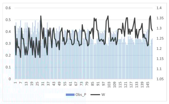 The data in Table 2 show that the adaptive weight strategy causes the number of nodes traversed and the pathfinding time to be less than the traditional A* algorithm. The efficiency of the algorithm traversing nodes after taking the adaptive scene weight is higher than the traditional A* algorithm. The variation curve of Obs_P and W(Obs_P) for some obstacles implemented by the adaptive weight strategy in Figure 5b is shown in Figure 6.