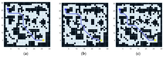 According to the distribution information of the three obstacles in Figure 3, the Obs_P is obtained by Equation (6), where A, B, and C are constant coefficients and A + B + C = 3. The proportional relationship of the three constant coefficients indicates the extent to which the distribution of obstacles in the three maps affects pathfinding.
