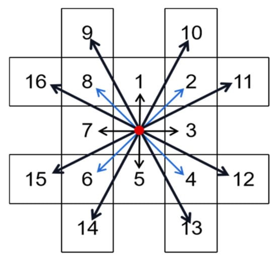 Considering the advantages and disadvantages of extending and reducing neighborhoods, in this paper, an extended neighborhood strategy based on the vector location relationship is designed to assign the search priority to neighbors and then search according to priority. Given that the search speed is reduced by too many neighborhoods, the 24 neighborhood directions that coincide with the traditional 8 neighborhoods are removed to form 16 neighborhood expansion directions, as shown in Figure 8.