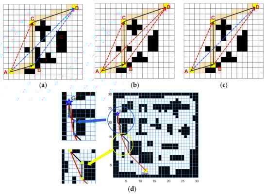 In Figure 10a, A->B->C->D is the planning path, the yellow squares A, B, C, and D are the turning points, the red dotted lines indicate that the barriers between two points can be directly connected, and the blue dotted lines indicate that there are obstacles between two points that cannot be directly connected. Since both A->D and B->D in Figure 10a pass through obstacles, the redundant node deletion strategy can be used to conclude that A->C-> D is the optimal path. Assuming that the paths A->D, A->C, and B->D in Figure 10b do not pass through obstacles, the redundant node deletion strategy directly determines that A->D is the optimal path based on the principle of the shortest line segment between two points. If B->D in Figure 10c also does not pass through obstacles, the redundant node deletion strategy will compare the distance between A->C->D and A->B->D and then select the path with the shortest distance as the optimal search path.