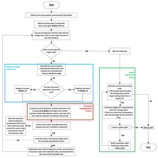 The adaptive weight strategy grants the algorithm adaptability to arbitrary maps and improves the pathfinding speed, but the path is not smooth enough and the path length cannot be guaranteed to be shorter. The extended neighborhood priority search strategy uses 16 extended neighborhoods and assigns the priority search strategy to further reduce the total number of traversal nodes, the number of path nodes, and the total turning angle of the path, which can ensure that the path planned by the algorithm is relatively better and can appropriately reduce the pathfinding time. The redundant node deletion strategy can reduce the redundant nodes on the path, smooth the path processing, and reduce the node storage pressure of the mobile robot. In order to ensure the A* algorithm can effectively reduce the number of nodes traversed and the total turning angle, and improve the search speed in any map path planning, in this paper, the adaptive weight adjustment strategy was integrated with the extended neighborhood priority search strategy and the redundant node deletion strategy, which combines the advantages of the three aspects to make up for the shortcomings of a single aspect, finally forming the ENMSA-A* algorithm proposed in this paper whose algorithm flow is shown in Figure 11.