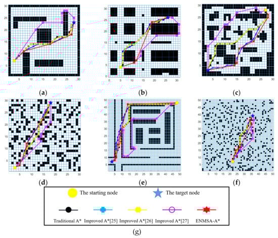 In order to test the performance of the ENMSA-A* algorithm proposed in this paper, MATLAB 2020b was used on the Intel(R) Core(TM) i5-7300HQ CPU @ 2.50GHz computer to simulate the traditional A* algorithm, the improved A* algorithm [], the improved A*algorithm [], the improved A*algorithm [], and the ENMSA-A* algorithm proposed in this paper in six scenario maps.