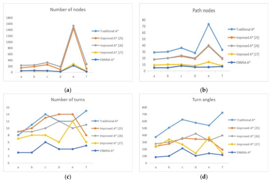 The ENMSA-A* algorithm proposed in this paper is optimal in four aspects: Traversal nodes, path nodes, the path turning angle, and the total turning angle. Compared with the traditional A* algorithm, the number of traversal nodes is reduced by 84.95%, the path nodes are reduced by 83.84%, the turning angle on the path is reduced by 62.28%, the total turning angle is reduced by 77.38%, the pathfinding time is reduced by 58.47%, and the total distance of the planned path is reduced by 3.36%. In summary, the ENMSA-A* algorithm proposed in this paper has good performance, and its performance robustness evaluation index V is 5.555, which is the highest among the four improved algorithms, indicating that the ENMSA-A* algorithm has excellent performance robustness.