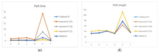 The data in Table 5 shows that the improved A* algorithm in the literature [] introduces a security factor and an extended 20-neighborhood search, so it is the shortest in terms of the length of the planning path, but its pathfinding time increased by 200.79% compared with the traditional algorithm, and the number of traversal nodes and the total inflection angle were also weaker than the ENMSA-A* algorithm proposed in this paper. The improved A* algorithm in the literature [] is not robust due to the improved weighting ratio needing to be averaged by multiple artificial weighting adjustments based on different scene maps, which are pre-planned and rely on scene environment information, and the pathfinding time is 1.1% higher than the traditional A* algorithm. Although the evaluation index of algorithm performance robustness is higher than the traditional algorithm by 1.2026, the improvement in other aspects is not optimal. The improved A* algorithm in the literature [] introduces the parent node and enhances the Chebyshev distance as the heuristic function weight, which reduces the total number of traversing nodes by 83.54% compared with the traditional algorithm, and the pathfinding time is also reduced by 85.85%, but at the cost of increasing the path length by 19.47%. There are multiple locally optimal solutions in the path, which cannot guarantee global path optimization, so the evaluation index of algorithm performance robustness V is 4.4438.