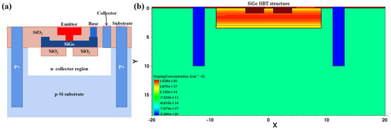 Schematic diagram (a) and the internal structure simulation profile (b) of the SiGe HBT.