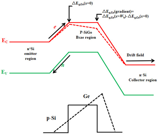 In this paper, a domestic SiGe HBT is selected as the research object, whose inner structure is similar to that of the traditional bulk silicon npn vertical bipolar transistor, as shown in Figure 1. The base region is composed of SiGe material with gradual change in components. The introduction of Ge in the base region forms a slow mutation heterojunction at the emitter/base pole junction (E/B junction) and base/collector junction (B/C junction), as shown in Figure 2. The built-in electric field formed in the base region effectively improves the carrier transit time in the base region. Current gain increases exponentially with the band-gap variation Δ after the introduction of Ge, as shown in the following equation: