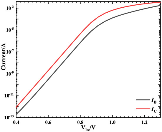 Figure 3 shows the Gummel characteristic curve of the SiGe HBT obtained by TCAD simulation in this paper; it is in good agreement with the simulation results obtained by others and the tested values by the semiconductor parameter tester KETHLEY4200. This indicates that the SiGe HBT structure model constructed in this work can accurately reflect the actual performance of the SiGe HBT. In this paper, the substrate is biased at −5 V and all other terminals are biased at 0 V to achieve the worst bias, except where it is specifically stated, for example, in the study of the effects of bias state on the single event effects of the SiGe HBT induced by heavy ions.