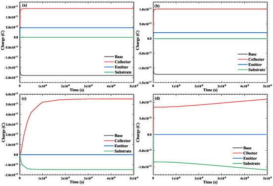Change in collected charge with time when heavy ions vertically irradiate the emitter of the SiGe HBT under the substrate inverse bias (a), positive bias (b), off bias (c) and collector positive bias (d) states.