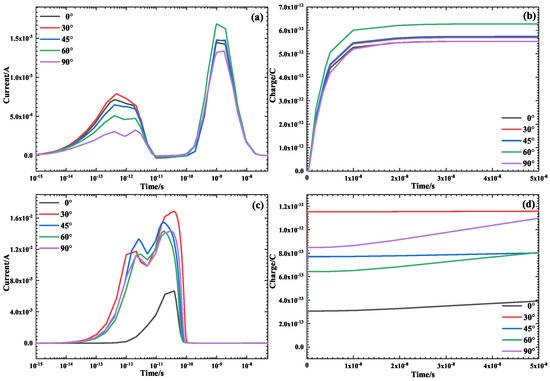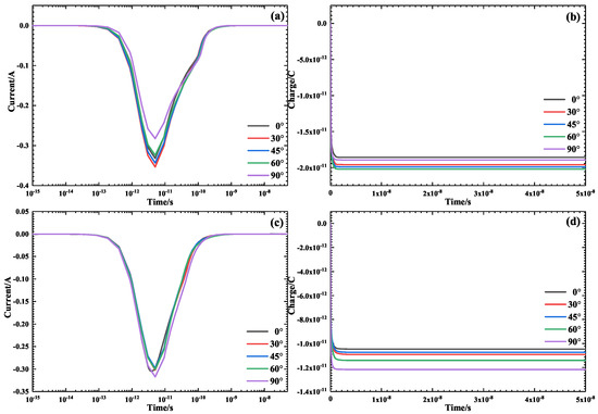 Figure 7 shows the current transients pulse and collected charge quantity of the collector as the heavy ions irradiate the collector and substrate of the SiGe HBT with different incident angles. When the heavy ions irradiate the collector, there are two transient peaks in the current of the collector caused by the drift and diffusion of electrons. The current transient peak value and collected charge quantity change with the incident angle. When the heavy ions irradiate the substrate, the current transient peak and pulse width of the collector are changed by the incident angle of the heavy ions. The current transient peak value and collected charge quantity of the collector caused by heavy ions irradiation with an angle of 0 is the lowest, while the values caused by heavy ions irradiation with an angle of 30 is the highest.