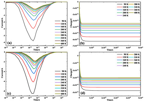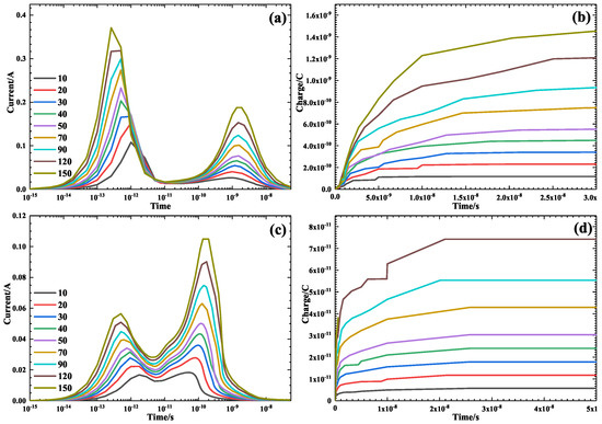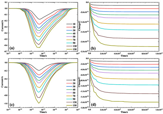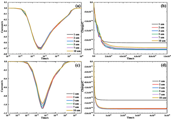 The number of electron–hole pairs in the SiGe HBT produced by heavy ions irradiation with different LET values is different, and the number of the electrons and holes in SiGe HBT increases with the heavy ions’ LET value. In the TCAD simulation, the LET value of the heavy ions is represented by the charge deposition quantity, and the charge deposition quantity of 0.1 pC/μm corresponds to the LET value of the heavy ions of 10 MeV·cm/mg. When studying the effect of the heavy ions’ LET values on the single event effects of the SiGe HBT, the charge quantity deposited by the heavy ions in the SiGe HBT is set to vary in the range 0.1 to 1.5 pC/μm, and the corresponding heavy ion LET values vary in the range 10 to 150 MeV·cm/mg. Figure 8 and Figure 9 show the change in the current and collected charge with time when the heavy ions with different LET values vertically irradiate the different terminals of the SiGe HBT. The current transient peak value, pulse width and collected charge increase with the heavy ions’ LET values.