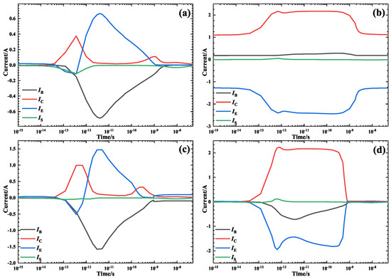 Change in current with time when heavy ions vertically irradiate the substrate of the SiGe HBT under the substrate inverse bias (a), positive bias (b), off bias (c) and collector positive bias (d) states.