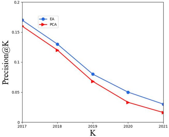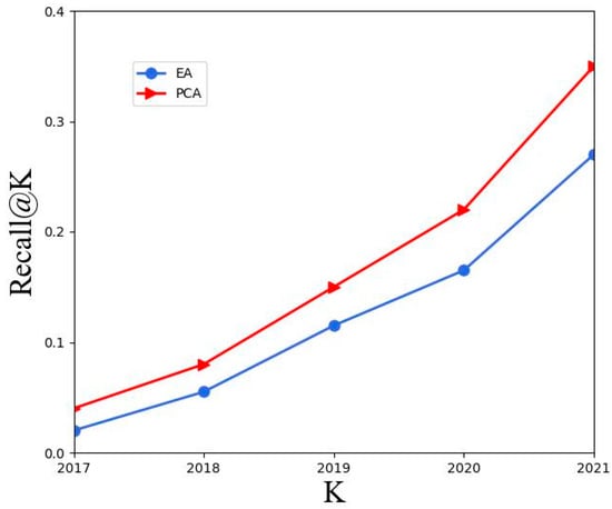 In order to validate the tourism product popularity analysis model, we selected Recall@K and Precision@K as the evaluation indicators to analyze the generated tourism products in terms of popularity. The performances of the models based on principal component analysis (PCA) and the model based on emotion analysis (EA) were compared for the collected tourism product data in 2018, 2019, 2020 and 2021. The experimental results are shown below.