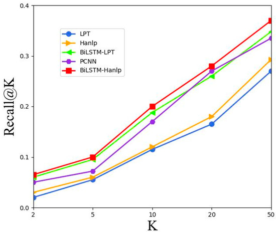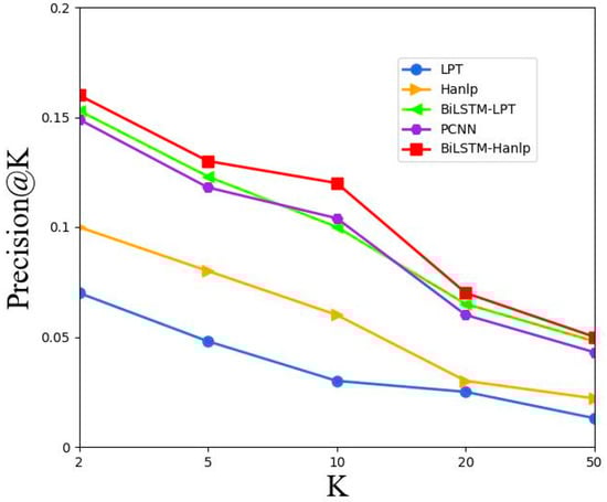 The deep learning baseline model selected in this paper is PCNN. The model separates the sentence into three segments by positioning the head entity and the tail entity. On this basis, the CNN convolution is introduced, and the maximum pooling is performed on each segment. The results of this comparative experiment are shown in Table 10 and Table 11. The experimental results are shown in Figure 6 and Figure 7.