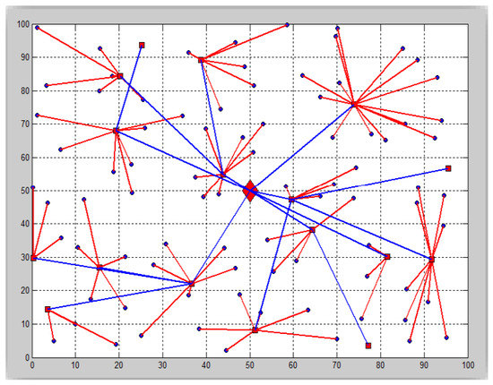 The proposed method depends on the distribution of 100 nodes in an area of 100 m × 100 m where the position of the BS is (50.50). The nodes consist of two types: 80 nodes have low resources (0.5 joules of energy, 25 bands, low compute capacity), and 20 nodes have higher resources (2 joules of energy, 40 bands, low compute capacitance). Figure 6 depicts WSN in our proposed method. The distribution of sensors in our method depends on the static distribution because it is applied in a healthy environment. Furthermore, MATLAB 2020b was used to perform the simulation under Windows7 64 bits operating system with CPU i5-2540M @ 2.60 GHz and RAM 4.0 GB. Examining the performance of our method is very important but it is very difficult to find similar methods to our method under the same conditions and parameters. Therefore, we tried to find the closest existing method and compare it with our method to prove its superiority and acceptability. Our proposed method is compared with the two existing methods: A highly dynamic secret key management (DSKM) [21] method and a smart security implementation (SSI) [22] method for WSN nodes under the same circumstance. Figure 7 displays the clustering stage utilizing the HEED approach. This figure shows the correlation of the sensors to the closest CH based on the HEED method.