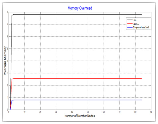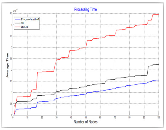 Figure 10 displays the size of memory used in the member sensor. In terms of memory expenditure in sensors, our method has a size of memory used less than precedent methods, which require twice the amount of memory. Figure 10 shows that SSI and DSKM are very memory-consuming compared to our method. Where we notice that the sensors in SSI are very memory-consuming compared to DSKM and our method. However, this figure shows that the health sensors in our method do not require large memory expenditures because we use lightweight techniques to generate shared keys and authentication keys. Figure 11 displays the processing time for generation shared keys. In comparison to the two existing methods, our proposed method to generate keys is lightweight. The use of HEED, RC5, Bloom and PRNG achieves fast and lightweight operations, which makes the processing time of our method very fast compared to SSI and DSKM. As we notice from Figure 11 that DSKM requires a very large processing time compared to SSI and our method. Finally, we note that our method is superior to SSI and DSKM in terms of energy consumption, memory expenditure in CHs, memory expenditure in sensors and processing time. However, there are some limitations to the proposed method. First, if the sensors are randomly distributed (in environments other than healthy ones), the results may differ. In a healthy environment, we can put the sensors in static locations, which provides the ability to control the stability of the results, but if they are used in a different environment, for example, the military, which requires random distribution, which may lead to different results. Data size and key sizes also can affect the results (it is left for future work). Duplicate data/information or decryption without detection of the encryption breach could consume WSN resources which are not addressed in this proposal.