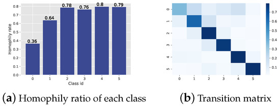 However, researchers have recently observed that nodes do not always tend to connect with nodes in the same class. This phenomenon is called heterophily, and there are also many cases in real scenes, such as heterosexual dating networks, protein interaction networks, and anomaly detection in systems that can be modeled as a graph [12,13]. Thus, the original neighbor smoothing strategy is no longer effective in theory. Therefore, in response to dealing with heterophilic graphs, researchers first defined the homophily ratio (HR) by the ratio of edges connecting nodes with the same class (intraclass edges) to total edges. Then, they proposed different strategies to process graphs guided by the homophily ratio. The definition of HR may have two fundamental problems that cause problems in processing graphs and even mislead research. First, the definition of the homophily ratio is based on the graph level, which ignores the multiple connection modes among classes, where some classes tend to connect with the same class while others may not. For instance, the homophily ratio of the commonly used dataset CiteSeer is 0.74, while as shown in Figure 1a, the HR of Class 1 is only 0.36. In this case, the design of GNNs guided by HRs may uniformly treat them as the same, which is not fair for Class 1. Therefore, it is difficult to define homophily in a scalar [14].