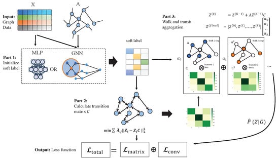 Through the overall description of the model, the end-to-end model training process can be divided into three parts. The first part obtains the probability distribution of initial node labels, the second part trains the transition matrix, and the third part is the aggregation. The details are shown in Figure 3, and the parts are described as follows: