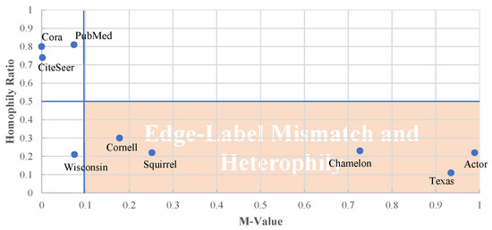We examine the value on commonly used benchmark datasets, and the results are shown in Table 6. To better clarify the relationship between the heterophily and the -value, we set HR = 0.5 as the discriminant for the homophily and heterophily and take M-value = 0.1 as the significance level for the label-edge mismatch problem. As shown in Figure 5, the value of five of the six heterophilic datasets is higher than 0.1, which indicates that they have a label-edge mismatch problem. This demonstrates that these datasets may be labeled inappropriately, such as in the Lazega Layers network being only labeled with the graduate school, which cannot reflect their relationship with co-workers. Alternatively, the edges do not describe the relationship between labels. For example, the lower -value of Actor indicates that using the co-occurrence to build edges is of little help to actor classification. GNNs usually have a low accuracy on these low -value datasets (except WebKB datasets, in which the node features provide much information for classification). Therefore, when evaluating graph-structured data, we should not only evaluate the relationship between labels and node features but also consider the relationship between edges and labels in nodes. Compared with the homophily ratio, the entropy of the edge can describe the information that edges provide, while the -value can test the problem behind the dataset.