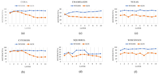 The performance of the WTGNN under different layers is tested and shown in Figure 6. In our method, the kth layer represents the aggregation of the probability estimates from the k-hop neighborhood. Figure 6 shows that the WTGNN basically achieves the optimal results when k = 5 and k = 6. This coincides with the six-degree separation theory [48]. When k = 6, the WTGNN aggregates information from almost the whole map. After layer 6, in contrast to that of the traditional GCN, its performance does not decline sharply but can remain at a good level. GCNs will be excessively smooth after 2–3 layers in homophilic datasets. This is because the layer coefficient alpha can balance the credibility of the probability estimates of each k-hop neighborhood, thus alleviating the problem of oversmoothing in the GNN.