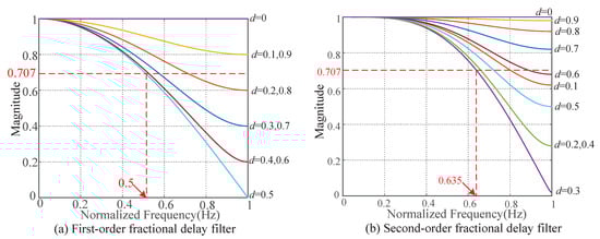In the formula, is a subfilter matrix, is a delay operator matrix, and U is a Vandermon matrix. For different fractional delay , the amplitude response of the first and second-order FD filters based on the Lagrange interpolation method is shown in Figure 3. It can be seen that the bandwidth of the first-order FD filter is 50% of the Nyquist frequency, and the bandwidth of the second-order FD filter is 63.5% of the Nyquist frequency. It shows that the FD filter based on the Taylor series expansion Farrow structure can effectively approximate the fractional delay . Generally, the first-order FD is sufficient to provide sufficient bandwidth to compensate for harmonic distortion, but higher-order FD can further reduce the error. In this paper, the order M = 2.