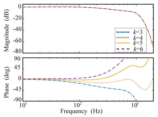 In order to determine the phase lead order k, the Bode diagram of at is given in Figure 6. It can be seen that when , the phase of is close to within , and the compensation effect is the best.