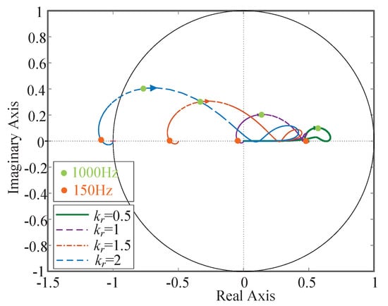 Define . Then when the locus of is in the unit circle, the system is stable. The internal model gain directly determines the error attenuation speed of the repetitive control system, and also affects the Nyquist curve of . It can be seen from Figure 7 that when , the trajectory of is always in the unit circle, and there is still a certain distance between the trajectory and the boundary of unit circle, indicating that the system has sufficient stability margin. The direction of the arrow represents the trajectory direction of the amplitude curve of from 0 Hz to Nyquist frequency. When is 0.5, 1, 1.5, and 2, respectively, the corresponding points of the amplitude of at 150 Hz and 1000 Hz are shown in the figure. It can be seen that when , the low frequency region of is closer to the center of the unit circle, and the controller has better low-frequency signal tracking ability in the low frequency region.
