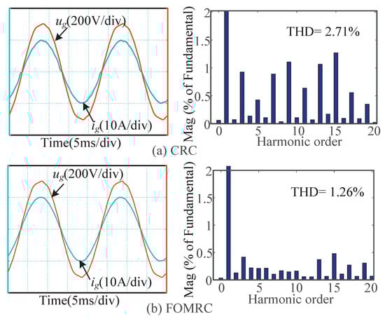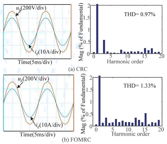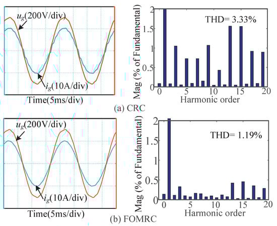 As can be seen from Figure 8, when , the output voltage and current waveforms of CRC and FOMRC are almost sinusoidal, the THD of CRC and FOMRC are and , respectively, both of them can effectively suppress the harmonic in the power grid.
