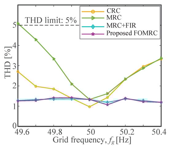 Currently, a number of scholars have used a third-order FIR filter based on Lagrange interpolation to approximate the fractional delay [16,17,18] and achieved good harmonic suppression results. To verify that the FOMRC proposed in this paper has similar performance, Figure 11 gives a comparison plot of the THD results of CRC, MRC, and MRC using FIR to approximate the fractional delay, and the FOMRC proposed in this paper when the grid frequency fluctuates in the range of . It can be seen that the THD of MRC is slightly reduced compared with CRC due to the halving of the sampling rate when the grid frequency is 50 Hz. The larger the grid frequency offset, the more serious the degradation of the harmonic rejection ability of MRC. The proposed method can obtain smaller THD values, better frequency adaptivity, and the same anti-frequency fluctuation capability as the method using FIR filter with approximate fractional delay.