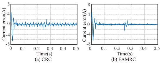 Figure 12 and Figure 13 show the dynamic performance of CRC and FOMRC control systems with reference current amplitude reduced from 10 A to 6 A at t = 0.25 s. When the fundamental frequency is 49.6 Hz, the current error of the CRC system is ±1 A, and that of the FOMRC system is ±0.3 A. When the fundamental frequency is 50.4 Hz, the current error of the CRC system is ±1.1 A, and that of the FOMRC system is ±0.3 A. The errors of the two control systems can converge again in two fundamental periods when the current changes abruptly at different frequencies. It can be seen that FOMRC and CRC have similar error convergence speeds when the power grid frequency fluctuates, but can effectively reduce the error.