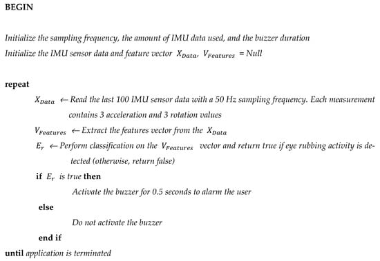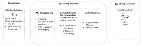 Figure 1 depicts a detailed description of the proposed system. The detection module consisted of three discrete stages: data processing, feature extraction, and a machine learning layer. As a prevention component, we applied a sonic feedback module. The input of the detection component was a sensor which incorporated an accelerometer along with a gyroscope that constantly provided six different types of data (i.e., x, y, and z components for both the accelerometer and the gyroscope). The acquired data were segmented by sliding overlapping windows, a commonly used technique used to capture transition effects. For each window, appropriate features were extracted, resulting in the feature vector. Finally, the feature vector was fed in a machine learning model and classified independently (i.e., instantaneous classification). As soon as eye rubbing was detected, the response module provided the user with a feedback action in order to remind the subject to stop the hand movement. The algorithm flow for data collection, feature extraction, and classification processes presented in this paper is depicted in Figure 2.