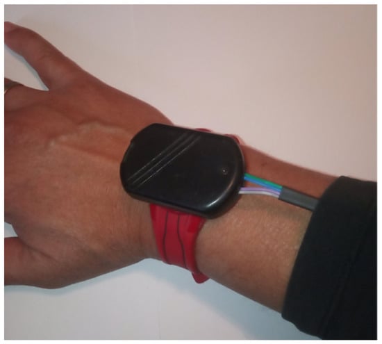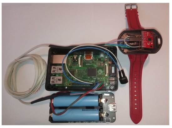 The experimental dataset for eye rubbing detection consists of accelerometer and gyroscope data. The SparkFun MPU6050 sensor was adopted as it provides both accelerometer and gyroscope sensing capabilities. The sensor transmits the data to a Raspberry-Pi minicomputer through wired connection (Figure 3). To the best of our knowledge, there is not database that exists with rubbing eye activity data. This equipment was properly mounted on the participant’s right wrist (Figure 4). The acquisition test had a 10 min duration. The participants were asked to perform usual free activities in an uncontrolled environment. A buzzer was actuated every one minute for five seconds, indicating the participants’ need to rub their eyes.