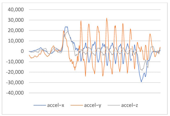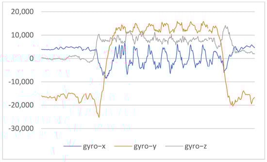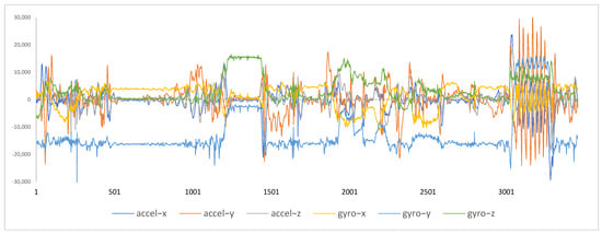 Figure 5 depicts a segment of the dataset. One second corresponded to 50 samples, since the sampling frequency was 50 Hz. The raw dataset consisted of acceleration values (accel-x, accel-y, and accel-z) and rotation values (gyro-x, gyro-y, and gyro-z) in the 3 axes. The output scale for each value was [−32,768, +32,767]. The signals corresponded to one-minute random activities, while an eye rubbing activity occurred in the last five seconds (samples 3000–3250). Figure 5 and Figure 6 focus on the eye rubbing activity.
