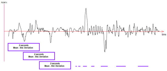 The time domain data are processed over sliding overlapping windows in order to consider transition effects. A window of 2 s was used with 50% (1 s) overlapping. The mean value and standard deviation were used as features. The feature extraction setup is depicted in Figure 8. Thus, 2 features were extracted for each axis and for each sensor (accel. and gyro), resulting in a vector consisting of 12 features. The specific setup was chosen as it was proven to be more effective in a relevant study [31].