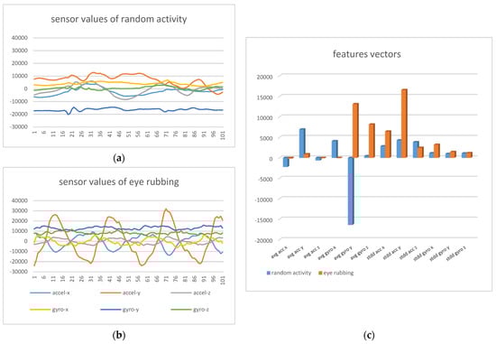 Figure 9 depicts the sensors’ raw data on random and eye rubbing activity and demonstrates the relationship between these data and the feature vector. A sample instance of images was used since the feature vector needs a large amount of data (600 values) to be calculated.