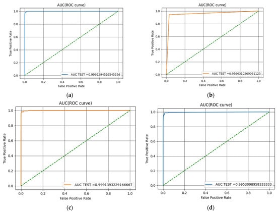 The AUC for the (a) SVM, (b) DTs, (c) RF, and (d) XGBoost classifiers.