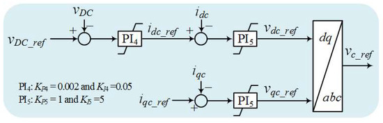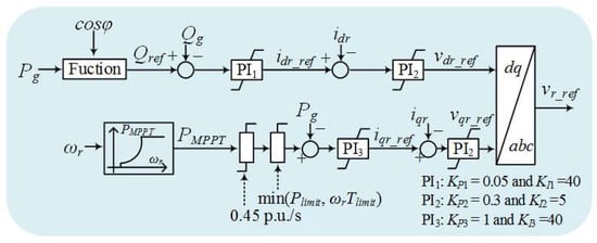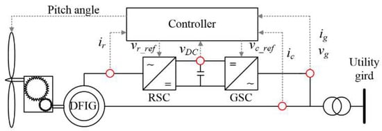 The control system, which comprises a rotor-side converter (RSC) and grid-side converter (GSC), determines the references and receives the measured values for voltage, power, DC-link voltage, and currents, as shown in Figure 2 and Figure 3. Active power control including the maximum power point tracking (MPPT) operation and inertial control are achieved in the RSC controller. The voltage of the DC-link is regulated by the GSC [].