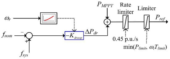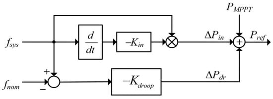 Figure 5 displays the structure of conventional scheme #1 (fixed gain scheme). The reference (Pref) comprises the output for the df/dt control loop (ΔPin, top loop), Δf control loop (ΔPdr, bottom loop), and MPPT control (PMPPT), as in Equation (17). Before a frequency disturbance, Pref is equal to PMPPT; after a disturbance, ΔPin and ΔPdr, which are dependent on the measured system frequency, are added to PMPPT.