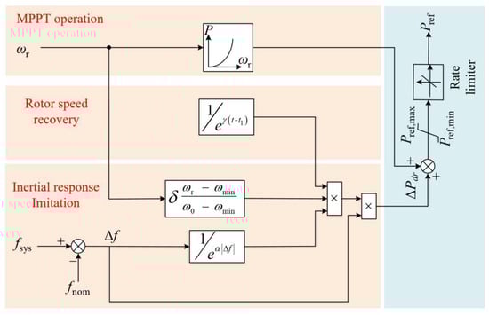 where σ(ωr) and η(fsys) are the operating conditions of the DFIG and the instantaneous system frequency, respectively. |Δf| indicates the absolute value of frequency deviation. α reflects the frequency support term and adjusts the performance of boosting the frequency support capability.