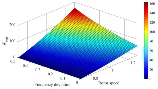 As shown in Figure 8, σ(ωr) determines that Ksup(fsys, ωr) is proportional to the rotor speed and is zero at ωmin to avoid stalling of the DFIG and make use of the significant amount of available kinetic energy to support the frequency under various wind conditions. η(fsys) determines that Ksup(fsys, ωr) is regulated by the |Δf|; thus, with the increase in |Δf|, a large value can be derived to reduce the ISFE under various disturbances.