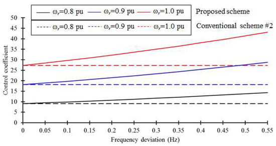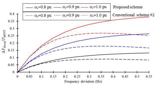 There are two features of Equation (22). The first is that Kdroop is zero when ωr = ωmin. As a result, conventional scheme #2 can avoid the stalling of the wind turbine. The second is that Kdroop increases with the rotor speed to effectively enhance the frequency support capability for various wind conditions (refer to []).