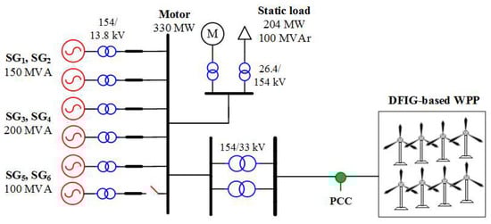 To study the effectiveness of the proposed IRI and RSR scheme, four cases with constant wind speeds under various wind speed conditions and disturbance were carried out using the test system shown in Figure 12. As disturbances, SG4, which generated 80 MW, was tripped out for Case 1 and Case 2, and SG4, which generated 140 MW, was tripped out for Case 3 to Case 4.