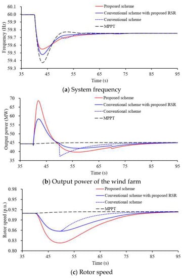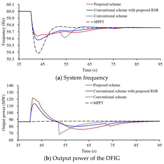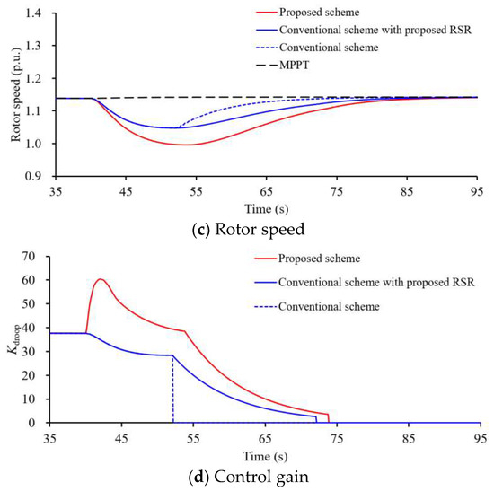 Since the gap between the power reference and the MPPT curve becomes small, less SFD of the conventional scheme is caused, as shown in Figure 14a,b. As in Case 1, when the DFIG was implemented on the proposed RSR control coefficient on the conventional and proposed schemes, the SFD could be minimized by smoothly decreasing the output power.