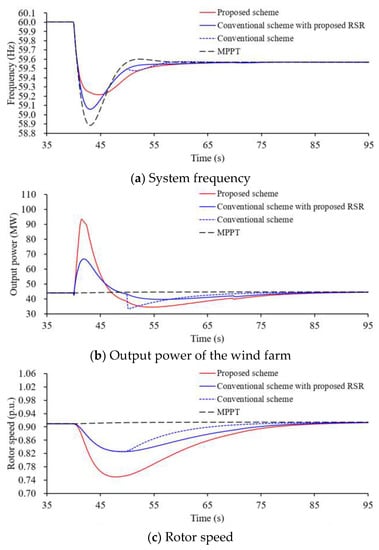 Figure 13 illustrates the results for Case 1. The frequency nadirs with the MPPT operation, conventional scheme, and proposed inertial control scheme were 59.378 Hz, 59.578 Hz, and 59.638 Hz, respectively. The frequency nadir for the proposed IRI scheme was the highest since the output power was significantly more than in the conventional scheme due to the control coefficient coupling with the frequency deviation, as illustrated in Figure 13a,b.
