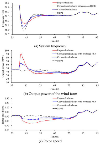 As shown in the simulation results, the proposed IRI scheme could improve the frequency nadir since the control coefficient is related to the rotor speed and frequency deviations. As the rotor speed decreases, the control coefficient for the IRI period will decrease, weakening the capability of the improvement in the frequency nadir, as indicated in Case 1, Case 2, and Case 4. As the size of the disturbance increases, the control coefficient becomes greater to improve the frequency nadir, as indicated in Case 2 and Case 3. As shown in the results for the RSR period, the control coefficient, which was applied in the conventional scheme and proposed scheme, could effectively alleviate the negative effects of RSR on the system frequency. This is because the suggested coefficient gradually decreases. However, in the case of the conventional scheme without RSR, this would result in a large SSFD.