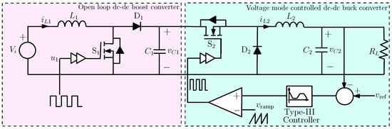 An open-loop boost converter loaded by a voltage-mode-controlled buck converter.
