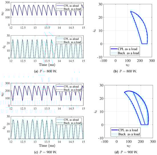 Figure 2 shows the behavior of an open-loop boost converter operating in DCM loaded, in the first case, by a tightly regulated buck converter with VMC and, in the second case, by an ideal CPL with the load power corresponding to a stable periodic regime and subharmonic oscillation in both cases. The agreement between the results depicted in Figure 2 was remarkable. Therefore, we continued our study by considering the load converter as an ideal CPL.