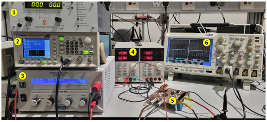 The experimental setup to observe period-doubling bifurcation in an open-loop boost converter with a CPL. ➀ Power supply, ➁ Function generator. ➂ Electronic load. ➃ Power supply. ➄ Boost converter circuit. ➅ Oscilloscope.